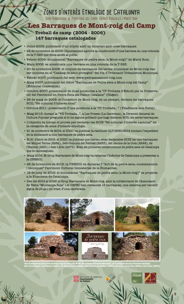 Han estat uns referents perquè han aconseguit la declaració de BCIN per a 5 de les barraques de pedra seca. La pedra de la nostra zona, de la Costa Daurada, és complicada de treballar per les seves propietats i la geometria. Són construccions arrodonides, diferents de les de la Terra Alta, per exemple. No trobem grans marges ni tampoc molta alçada, perquè caurien, però sí que hi ha barraques de falsa cúpula que són impressionants. I no en veiem més, de marges, perquè en els últims 50 anys el motor en aquest territori ha estat la indústria i s’han abandonat els cultius. A l’Ebre, en canvi, se’n troben més.